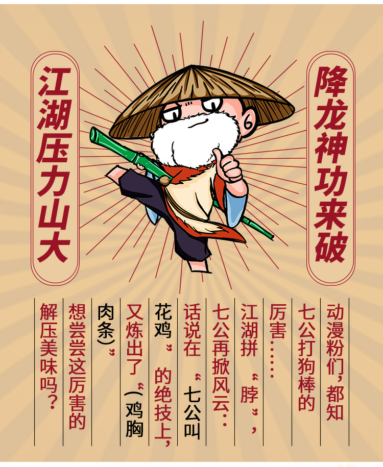 虹七公叫花雞雞胸肉條的產(chǎn)品標(biāo)準(zhǔn):以獨(dú)家135℃高溫雙面蒸、煎、烤工藝,快速鎖鮮的同時(shí),在舌尖咀嚼的每一口,你品味到的是既焦又嫩,豐富又可口的極致口感。