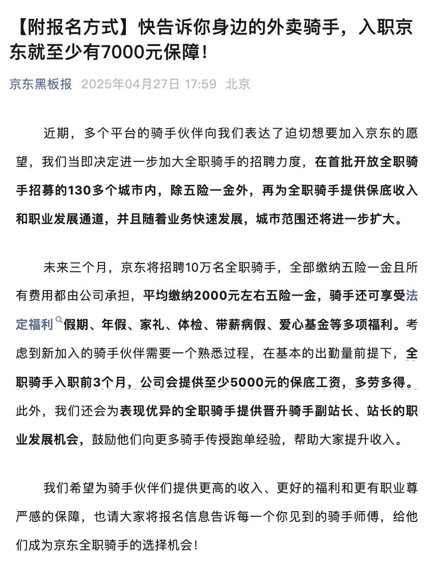 當前位置:中國e直播帶貨供應鏈機構>今日閱讀 據(jù) " 京東黑板報 " 微信公眾號,未來三個月,京東將招聘 10 萬名全職騎手,全部繳納五險一金且所有費用都由公司承擔,平均繳納 2000 元左右五險一金,騎手還可享受法定福利假期、年假、家禮、體檢、帶薪病假、愛心基金等多項福利??紤]到新加入的騎手伙伴需要一個熟悉過程,在基本的出勤量前提下,全職騎手入職前 3 個月,公司會提供至少 5000 元的保底工資,多勞多得。