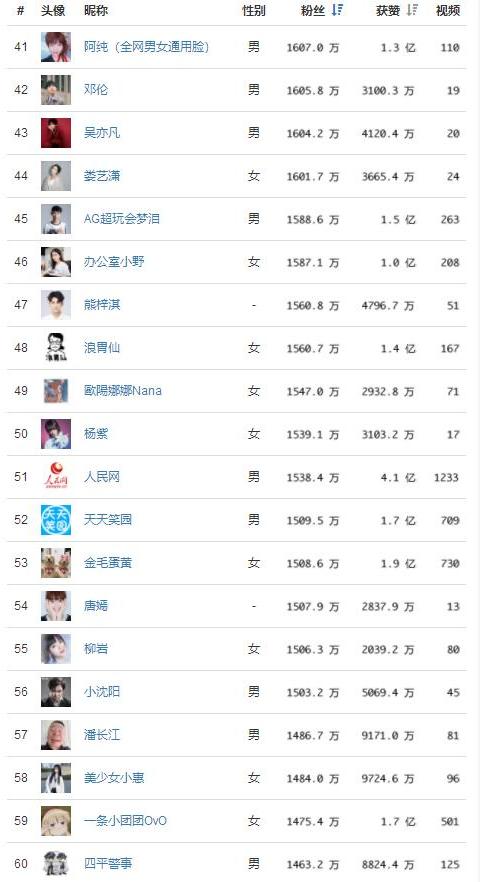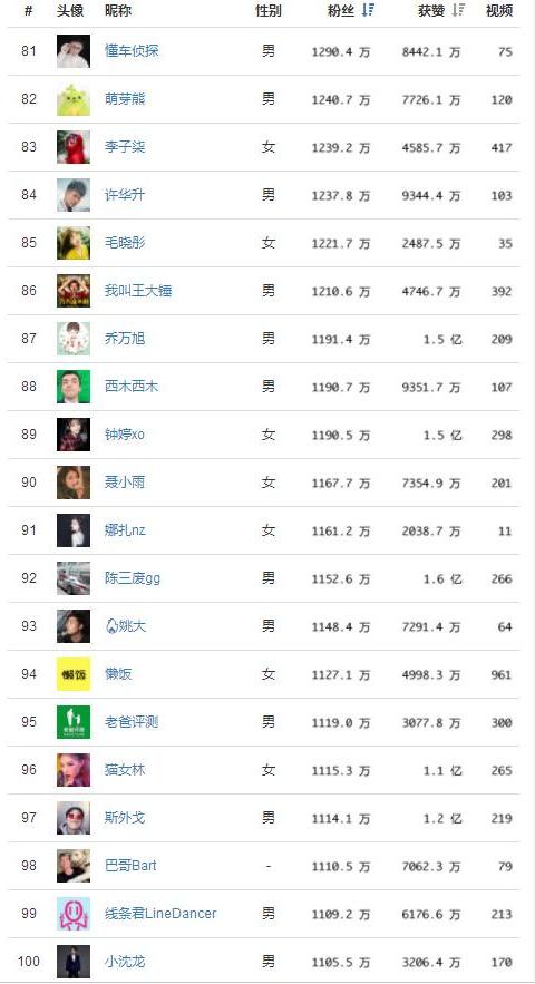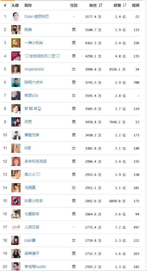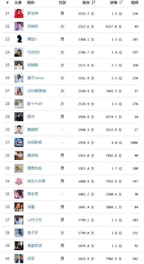 網(wǎng)紅的粉絲數(shù)來進行統(tǒng)計排名,同時還給出了網(wǎng)紅獲贊的數(shù)據(jù),粉絲量數(shù)據(jù),點贊數(shù)據(jù)與發(fā)布視頻量總數(shù)居!看看這份榜單你關注了幾個?