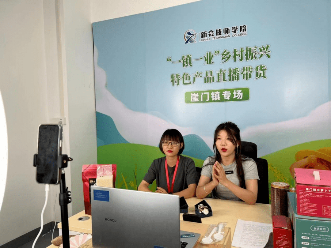 江門市人大代表、崖門鎮(zhèn)明蘋村黨委書記李春妮(左一)直播帶貨現(xiàn)場(chǎng)