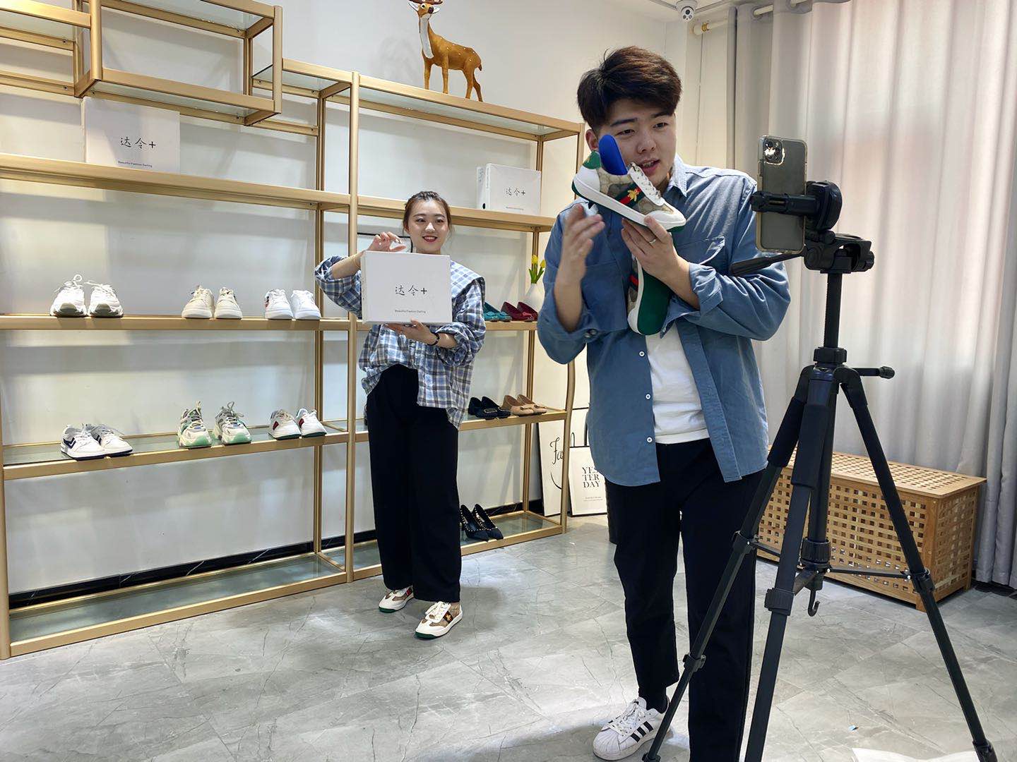 主播崔文超、張立平直播帶貨女鞋。