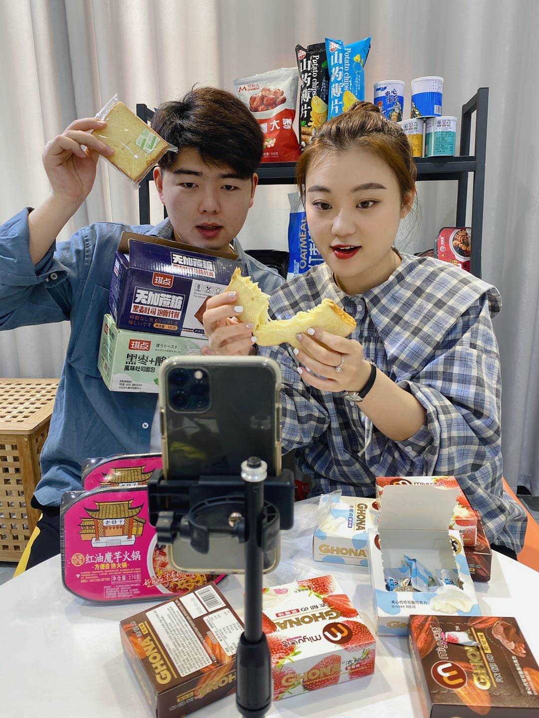 主播崔文超、張立平直播帶貨零食。