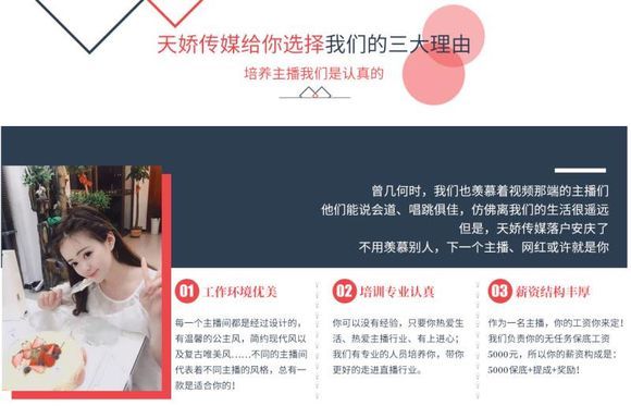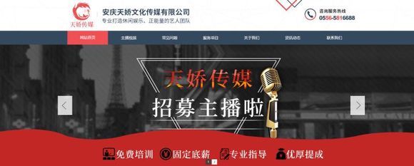 安慶天嬌傳媒文化有限公司,經(jīng)營范圍:演出經(jīng)紀(jì);藝人經(jīng)紀(jì);影視服裝,道具及器材的租賃;劇本的創(chuàng)作及策劃;市場推廣活動及市場營銷的策劃;文化藝術(shù)交流活動的組織;攝影影像服務(wù);會議會展服務(wù);企業(yè)形象設(shè)計。目前安慶天嬌傳媒總部規(guī)模(2000多個平方,50多個直播間)