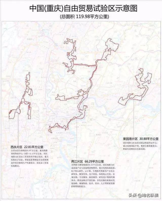 中國(重慶)自由貿(mào)易試驗(yàn)區(qū)實(shí)施范圍為119.98平方公里,涵蓋兩江片區(qū)、西永片區(qū)、果園港片區(qū)3個(gè)片區(qū),2017年4月1日正式掛牌。
