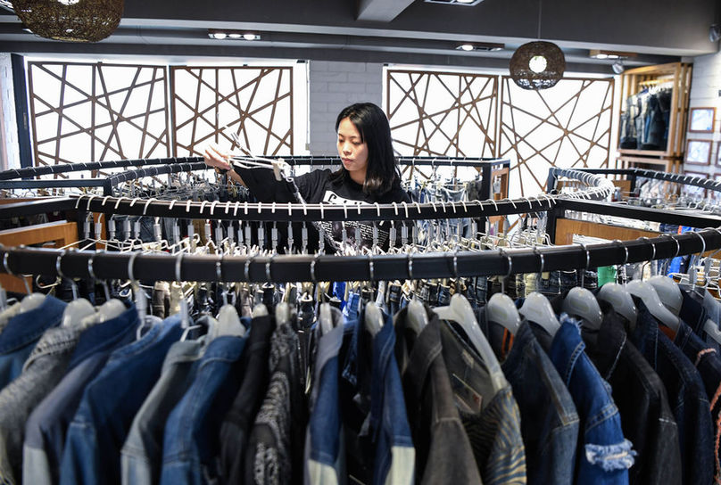 廣東省紡織品進(jìn)出口股份有限公司,工作人員在整理第132屆廣交會(huì)線上展廳的服裝(鄧華/攝)