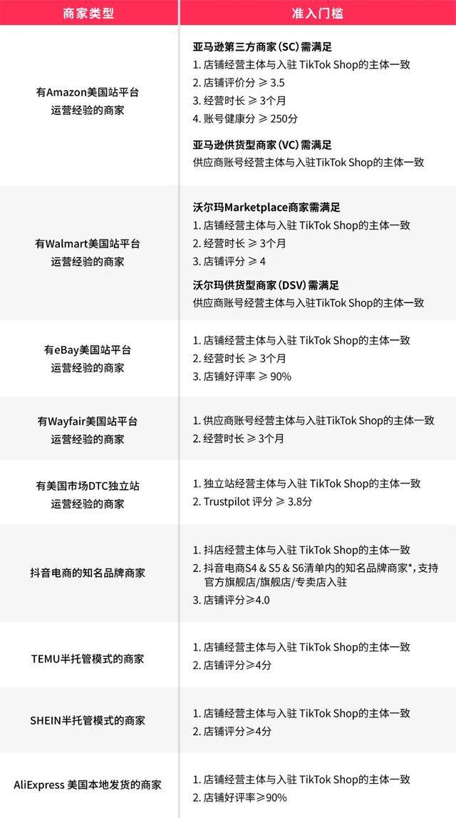 另一方面則是降低了已支持平臺(tái)商家的入駐門(mén)檻,例如亞馬遜的店鋪評(píng)分要求從最高4.0調(diào)整為3.5,取消了Walmart、Wayfair、eBay的50萬(wàn)流水要求,取消了DTC獨(dú)立站的粉絲要求等。與此同時(shí),新增了抖音電商知名品牌的快速入駐、抖店的店鋪評(píng)分要求也下調(diào)到4.0。