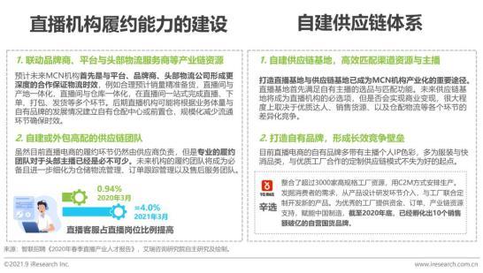 垂類市場的發(fā)展前景直播電商帶動服務(wù)商高速增長,垂直領(lǐng)域深耕是新機(jī)會點直播電商規(guī)模擴(kuò)大和生態(tài)圈的逐步完善促進(jìn)了服務(wù)商的發(fā)展以及業(yè)務(wù)的進(jìn)一步細(xì)分,服務(wù)商以專業(yè)的能力為更多入場的商家提供賬號運營、直播運營以及其它全流程的電商服務(wù),為平臺提供可觀的交易量,為消費者提供優(yōu)質(zhì)的購物體驗,服務(wù)商的重要性日趨顯著。2020年服務(wù)商營收規(guī)模達(dá)到2463億元,預(yù)計2023年將超過1.2萬億元,年復(fù)合增長率達(dá)72.2%。目前服務(wù)商市場競爭逐漸激烈,在垂直類目培養(yǎng)出頭部主播或在垂直類目積累出更多優(yōu)秀案例的新入局服務(wù)商更有可能在競爭中留存。未來服務(wù)商會有更多樣的角色出現(xiàn),衍生更多新行業(yè)與機(jī)會。一方面2020年受疫情影響,主播數(shù)量迅速增加,競爭更加激烈,另一方面,直播用戶心智也更加成熟,對專業(yè)化內(nèi)容需求增加,主播需要體現(xiàn)其對產(chǎn)品的專業(yè)度才能提高消費者的信任度從而觸發(fā)轉(zhuǎn)化,此外,直播品類更加分散,母嬰、保健等品類占比不斷上升。因此無垂類專業(yè)度的主播轉(zhuǎn)型帶貨成功的概率降低,多數(shù)主播的發(fā)展路徑是,最初深耕一個品類培養(yǎng)高忠誠度高轉(zhuǎn)化的私域流量,隨著直播場次、時長與流量的積累,吸引更多品牌商合作,擴(kuò)大貨品池,主播的優(yōu)勢品類占比逐漸降低。構(gòu)建差異性壁壘(1/2)直播機(jī)構(gòu):加強(qiáng)對履約鏈路的把控能力、自建供應(yīng)鏈基地/平臺、與廠商合作積淀出長期品牌,實現(xiàn)B端商業(yè)化破圈未來將有更多的直播機(jī)構(gòu)加強(qiáng)對供應(yīng)鏈上下游的滲透以及對產(chǎn)業(yè)鏈合作資源的滲透。首先,促進(jìn)產(chǎn)業(yè)鏈各方高效合作,尤其是與頭部物流公司達(dá)成面向直播電商的針對性合作,同時細(xì)化并匹配自有供應(yīng)鏈團(tuán)隊。此外,MCN機(jī)構(gòu)將逐步打造自有品牌以及建立自有供應(yīng)鏈,由機(jī)構(gòu)中的頭部主播牽頭,撬動更多的產(chǎn)業(yè)帶資源,同時形成自有的供應(yīng)鏈平臺,實現(xiàn)渠道資源與主播的雙向賦能。最后與優(yōu)質(zhì)供應(yīng)鏈合作,參與研發(fā)生產(chǎn)環(huán)節(jié),降低對主播的依賴性,打造自有品牌,形成長效的競爭壁壘。構(gòu)建差異性壁壘(2/2)主播:上播門檻提高,主播需要對垂類產(chǎn)品有深入的了解主播存在入行壁壘,但在初期流量紅利的加持下并不明顯,隨著行業(yè)不斷成熟競爭不斷激烈,以及政策監(jiān)管趨嚴(yán),主播準(zhǔn)入門檻將持續(xù)提高,主播專業(yè)度的重要性增加。表征為2021H1行業(yè)主播的凈流入較2020年放緩,底層原因是,雖然行業(yè)沒有階層固化,但是培養(yǎng)一名腰部及以上主播的難度增加,對新人的要求也逐步提高。其一,監(jiān)管趨嚴(yán),對社交媒體和視頻直播購物從業(yè)人員的培訓(xùn)與上崗提高了要求;其二,流量采買的成本增加,目前培養(yǎng)一位主播的啟動資金至少需要數(shù)百萬;其三,整體行業(yè)已經(jīng)過了招聘爆發(fā)期,經(jīng)過了一輪淘汰洗牌后,行業(yè)已經(jīng)存續(xù)了一批適合且小有規(guī)模的主播;其四,行業(yè)經(jīng)過不斷地試錯與發(fā)展,行業(yè)準(zhǔn)入門檻與上播門檻同時提高,尤其是當(dāng)顏值、毅力、表達(dá)力等成為必備質(zhì)素,專業(yè)度成為主播更有價值的競爭壁壘,需要主播對自己的主攻品類有深入的了解與強(qiáng)專業(yè)度,并且要深入了解供應(yīng)鏈的所有環(huán)節(jié),專業(yè)化的培訓(xùn)不可或缺。