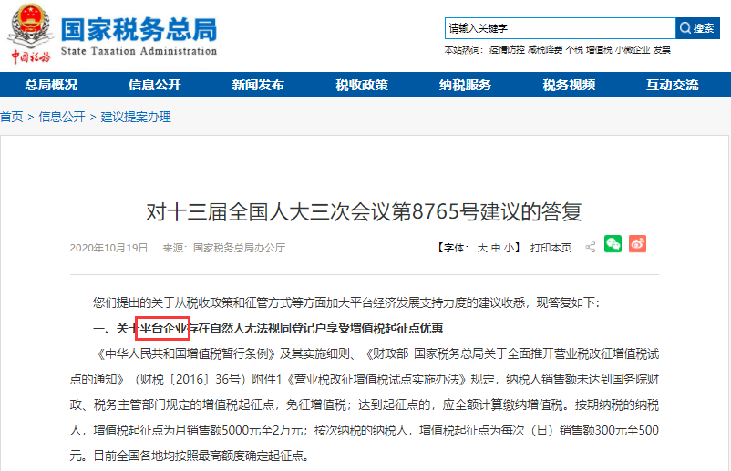 近日,國家稅務總局對十三屆人大三次會議第8765號建議進行了答復。