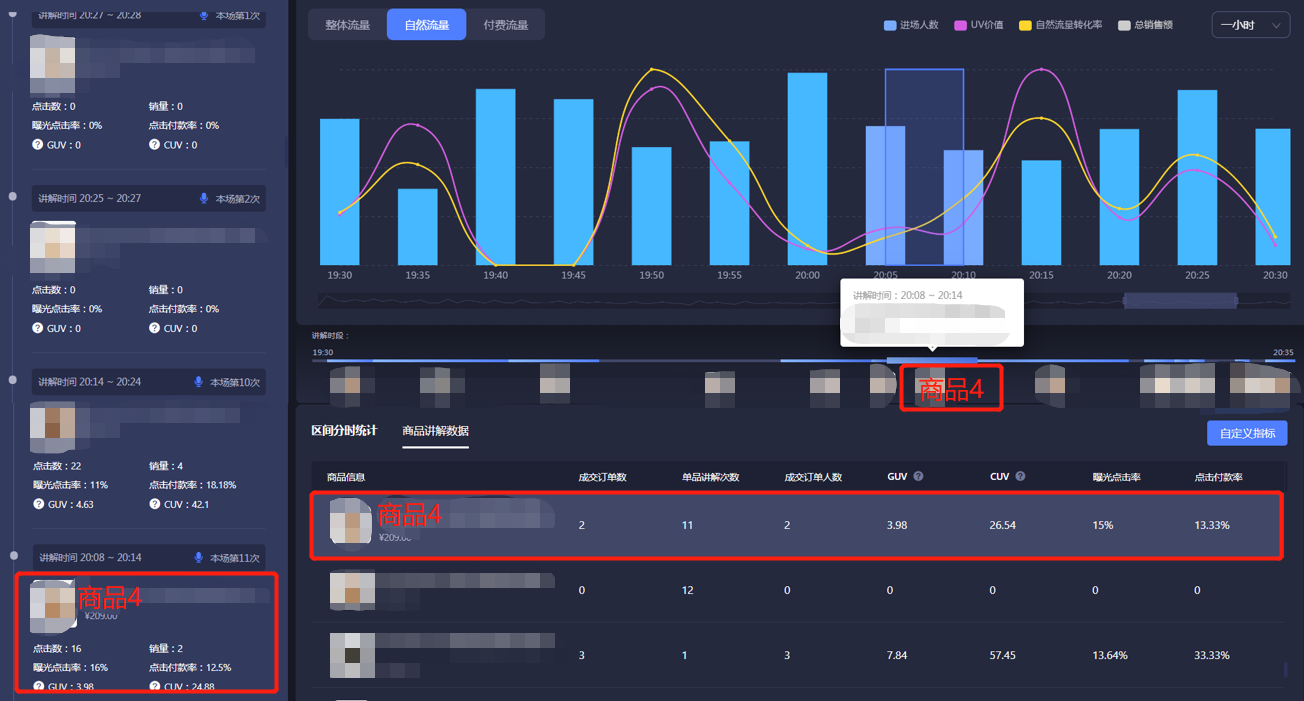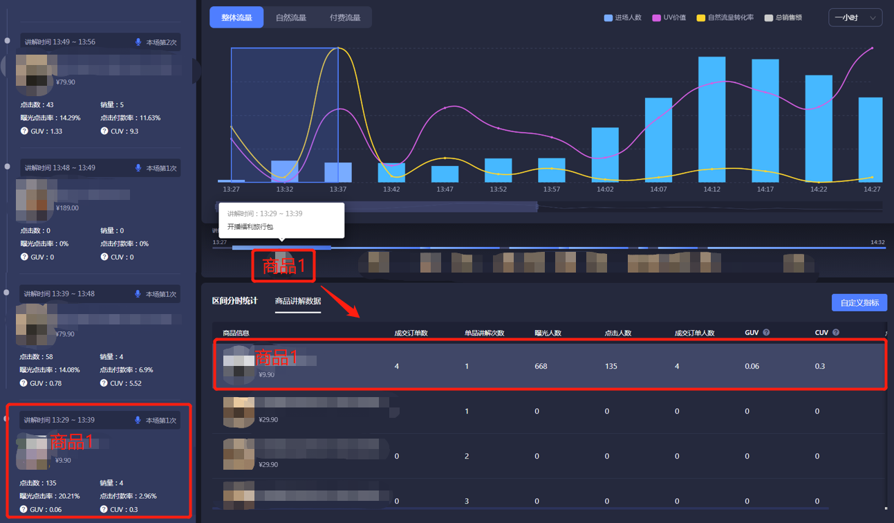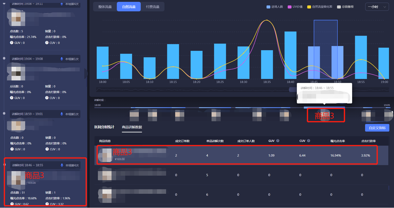比如,該直播間在講解商品1時(shí),這5分鐘時(shí)段內(nèi)的第3分鐘時(shí)UV價(jià)值100%未完成,互動(dòng)率10.92%未完成,數(shù)據(jù)轉(zhuǎn)化都還沒(méi)有達(dá)到上一時(shí)段5分鐘的水平,那么下一時(shí)間段自然流可能會(huì)減少。