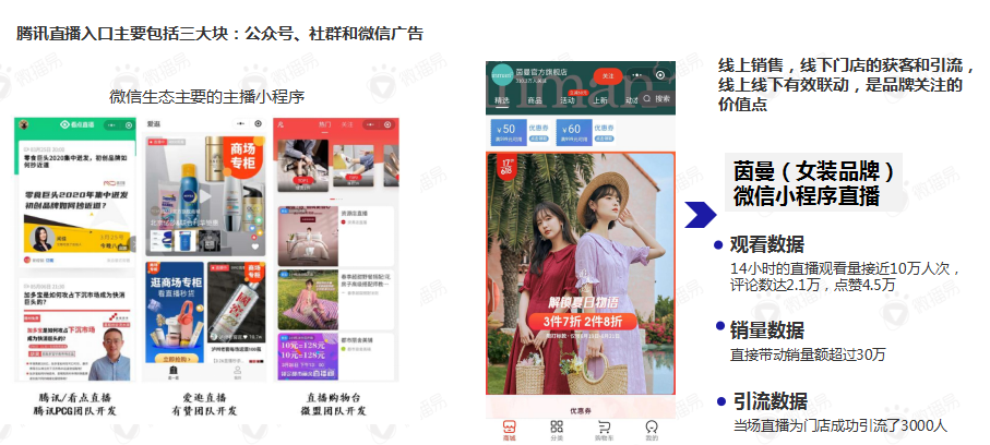 目前,騰訊直播作為工具,出現(xiàn)在商家本身的微信生態(tài)中,入口主要包括三大塊:公眾號(hào)、社群和微信廣告。