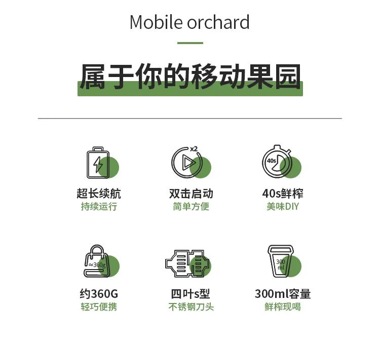 4、304食品級不銹鋼一字刀頭均勻切碎果汁細膩,300ml精致容量輕松入袋整機僅370g,不含雙酚A加厚食品級PC材質(zhì)。
