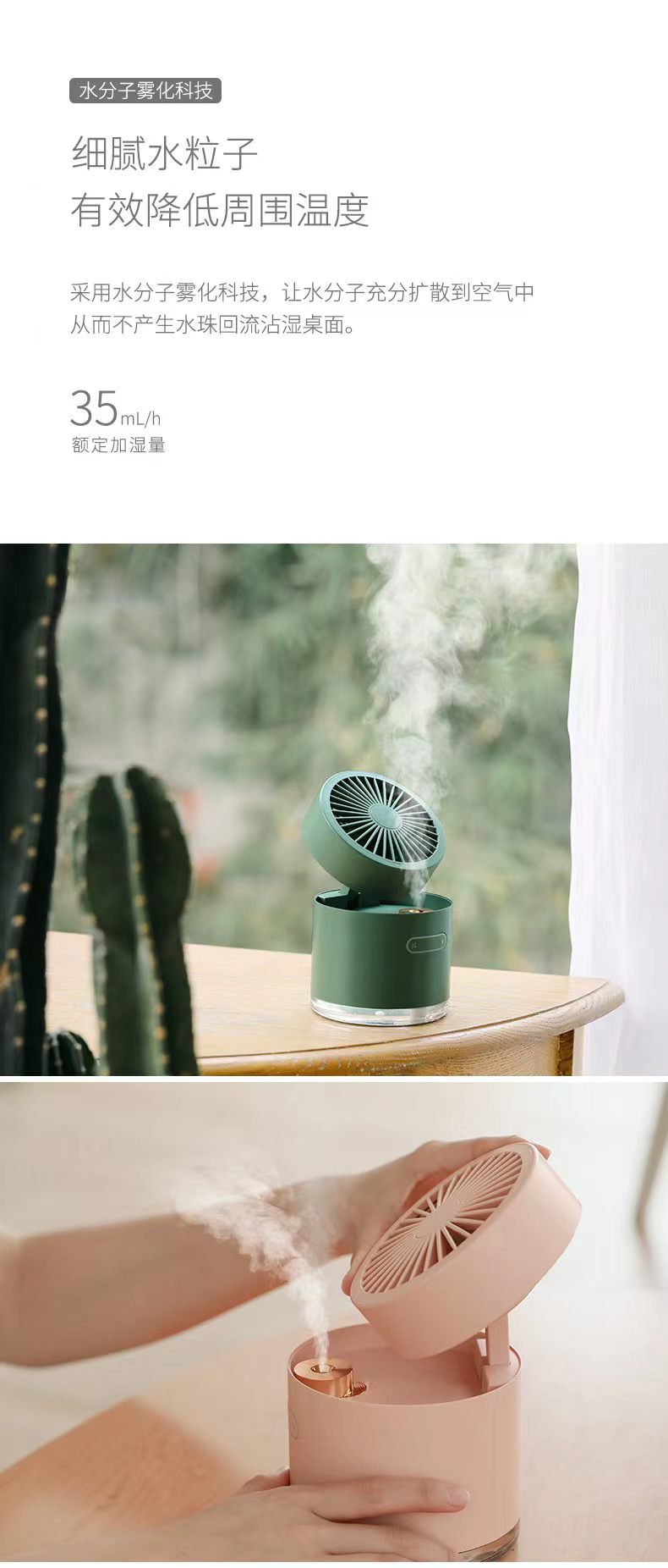 折疊風(fēng)扇加濕器采用的是水分子霧化科技,降低空氣溫度的同時(shí),不會(huì)產(chǎn)生水珠回流沾濕桌面。細(xì)膩的水粒子迅速滲透肌膚,讓肌膚更容易吸收水分,解決了在悶熱封閉空間帶來的皮膚發(fā)熱、干癢等皮膚問題。夏天中午人最容易疲累,午休起來打開風(fēng)扇加濕器,細(xì)膩的水霧和輕柔的涼風(fēng)拂面而來,整個(gè)人都精神十足~