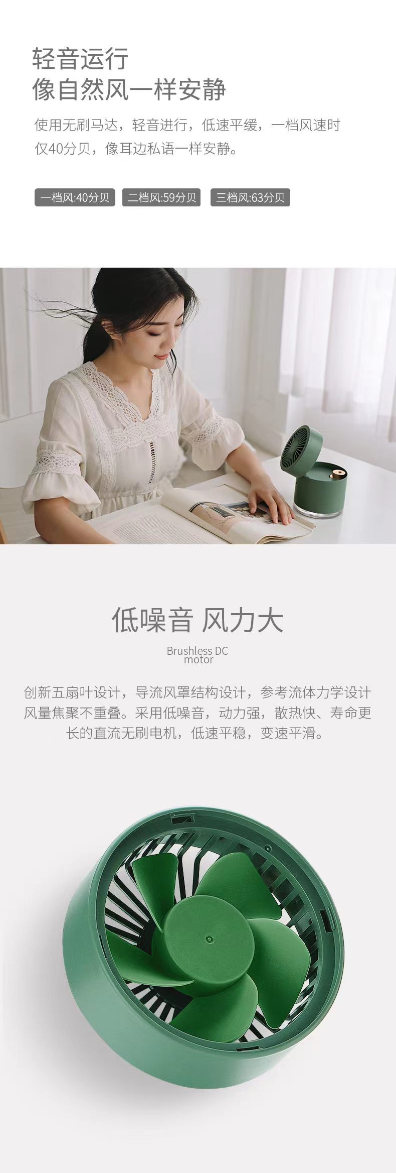 便攜可移動(dòng)桌面風(fēng)扇,377g輕便攜設(shè)計(jì),水分子霧化科技細(xì)膩水粒子有效降低周圍溫度三擋風(fēng)力靜柔隨心,一鍵控制,輕音運(yùn)行像自然風(fēng)一樣安靜,使用無刷馬達(dá),輕音進(jìn)行,低速平緩一檔風(fēng)速時(shí)僅40分貝創(chuàng)新五葉設(shè)計(jì),導(dǎo)流風(fēng)罩結(jié)構(gòu)設(shè)計(jì),參考流體力學(xué)設(shè)計(jì)風(fēng)量焦聚不重疊180°自由風(fēng)向隨你掌控,內(nèi)置2000mAh電池容量。